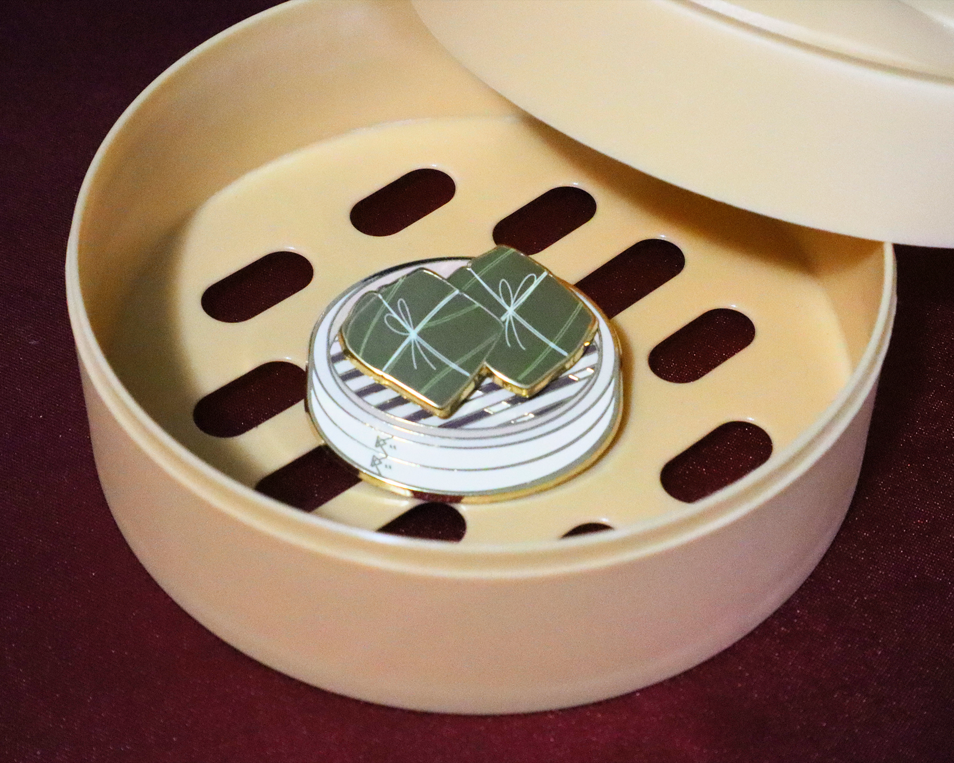 Note: The base steamer does not come with backing posts. It is intended for the dish to be on top and be able to swap out different dishes and create a more 3D effect. All dishes except for the chopsticks fit into the base steamer. The dishes can also be used as a standalone pin.